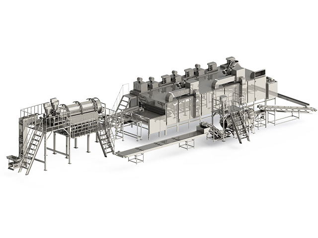 簡介:采用噴淋、涂層、鍍膜工藝及多層調(diào)味技術(shù),從溶液、前粉、后粉三部分來進行調(diào)味,產(chǎn)品口感更加豐富立體。裹衣單元中噴淋設(shè)備內(nèi)部獨特的結(jié)構(gòu),大大提高了原輔料的接觸機會,裹衣效果更加均勻,降低了產(chǎn)品的次品率。堅果仁原料以及半成品通過傳送帶運輸,依次經(jīng)過提升機進入主要加工設(shè)備——連續(xù)式淺粉涂裹設(shè)備,然后進行油炸/烘烤,進行二次裹粉調(diào)味后再進入冷卻,再進行包裝,全自動化連續(xù)作業(yè)提高生產(chǎn)效率,保證產(chǎn)品品質(zhì)。