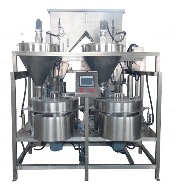 裹衣原料儲(chǔ)存在料斗中,由PLC控制自動(dòng)出料,通過(guò)稱(chēng)重料斗自動(dòng)稱(chēng)重,原料自動(dòng)投入到裹衣桶中,通過(guò)裹衣桶旋轉(zhuǎn)盤(pán)帶動(dòng)原料進(jìn)行運(yùn)轉(zhuǎn),料液通過(guò)容積泵和高速甩液盤(pán)將料液均勻涂灑到原料表面,粉料通過(guò)自動(dòng)定量給粉系統(tǒng)投入到裹衣桶中,實(shí)現(xiàn)一次裹粉作業(yè)過(guò)程,循環(huán)的次數(shù)取決于產(chǎn)品工藝參數(shù)要求,可設(shè)定不同裹衣次數(shù),以實(shí)現(xiàn)不同裹衣產(chǎn)品。全裹衣過(guò)程準(zhǔn)確控制每次投入的粉劑和料液,以便達(dá)到每次裹衣的一致性。